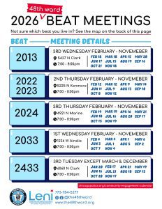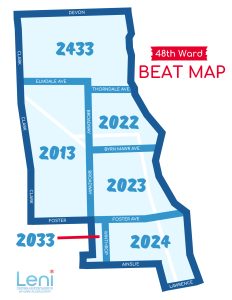Residents can find their specific beat, meeting times, and locations on The 48th Ward website or by using the CPD’s Find My District tool. Of course your welcome to attend any meeting.