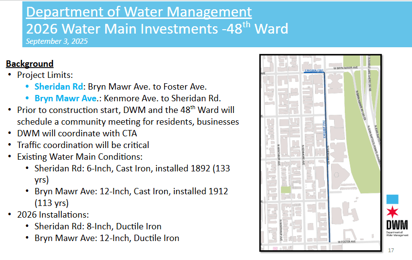 The DWM Water Main project on Sheridan Road (Bryn Mawr to Foster) is currently with IDOT for permit review. The project is scheduled for a June start-date. We will have a community meeting regarding this project before it begins. Once DWM is finished, this part of Sheridan Road will be resurfaced.