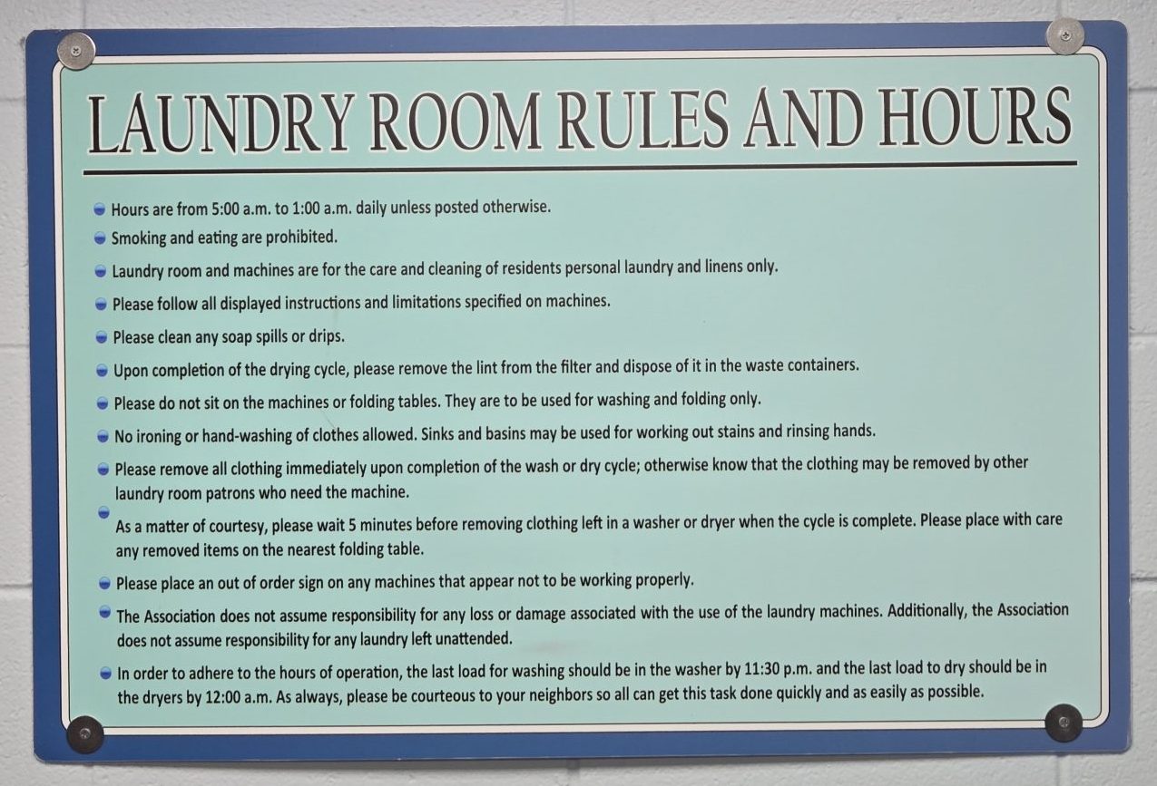 · PLEASE OBEY THE POSTED RULES, REGULATIONS and all machine instructions. In addition, below we have quoted the Laundry Room rules from the PTCA handbook.
